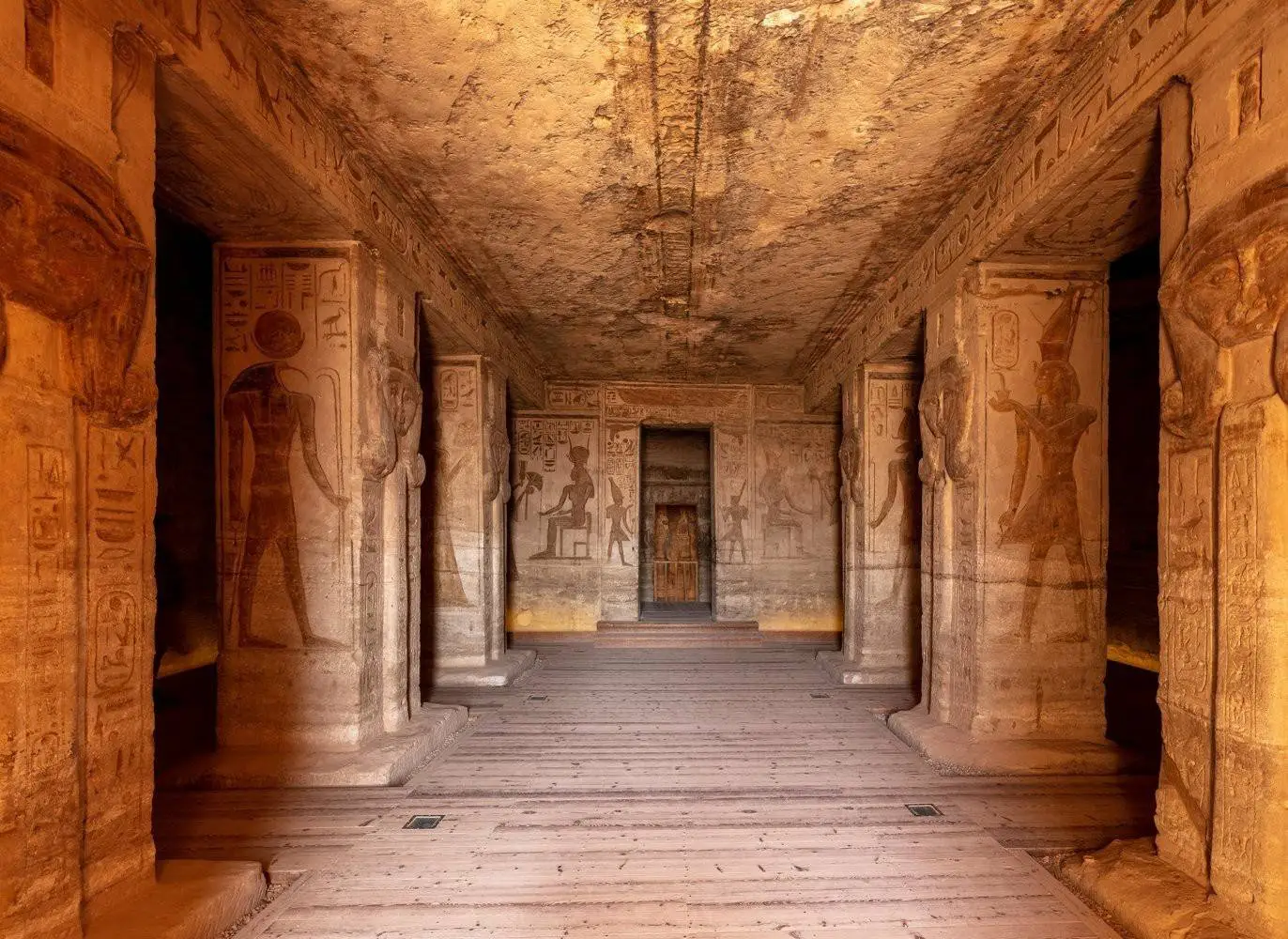 在阿蒙·拉与拉·荷拉克提大神庙前,四座高达20米的拉美西斯二世巨像雄伟地坐镇,凝视着辽阔的沙漠。您将在导游的精彩讲解中了解神庙的历史,随后有自由时间进入神庙内部参观。神庙内部深入山体约60米,墙壁上布满雕像与浮雕,展示了拉美西斯二世的军事胜利与俘虏场景。神庙后壁上还可见供奉阿蒙、拉·荷拉克提、普塔三位神灵及被神化的拉美西斯本人的雕像。