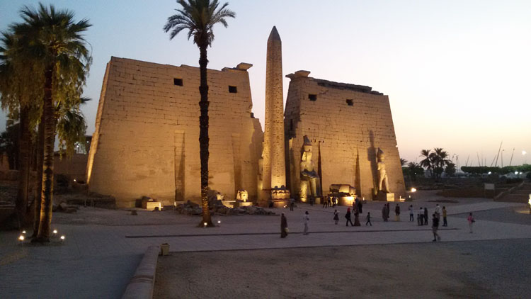 最后参观卢克索神庙,进入神庙时可以看到两座巨大的拉美西斯二世雕像以及一座粉红色花岗岩方尖碑(另一座现立于法国巴黎协和广场)。卢克索神庙由阿蒙霍特普三世与拉美西斯二世共同建造,始建于公元前1400年左右,历经数百年才完工。