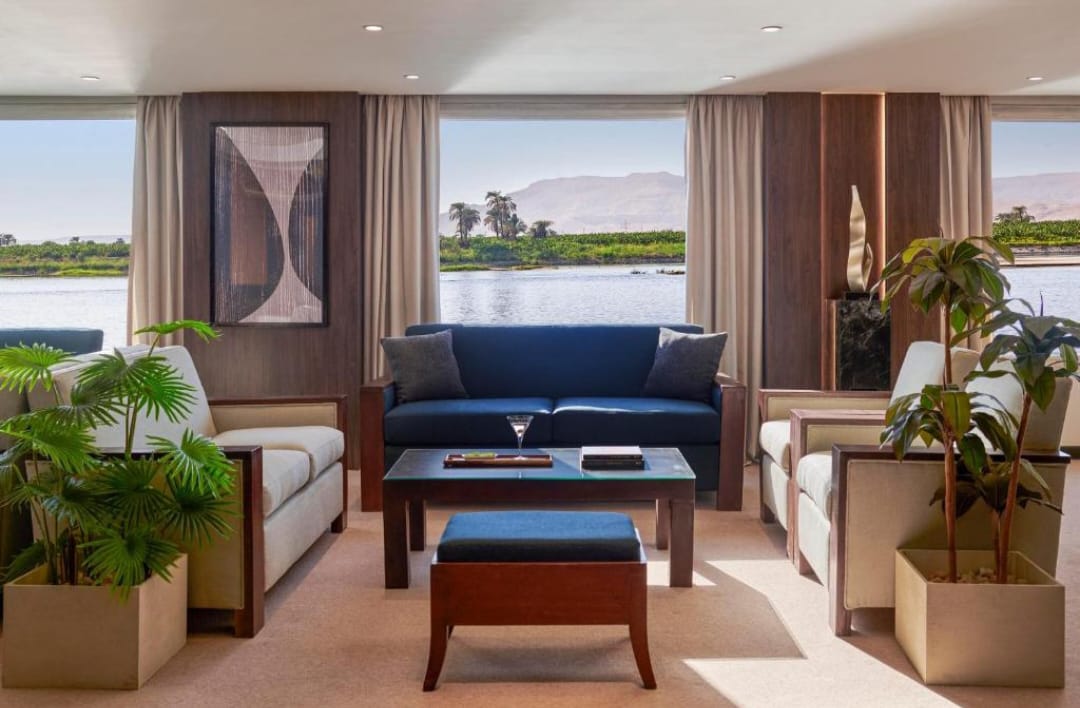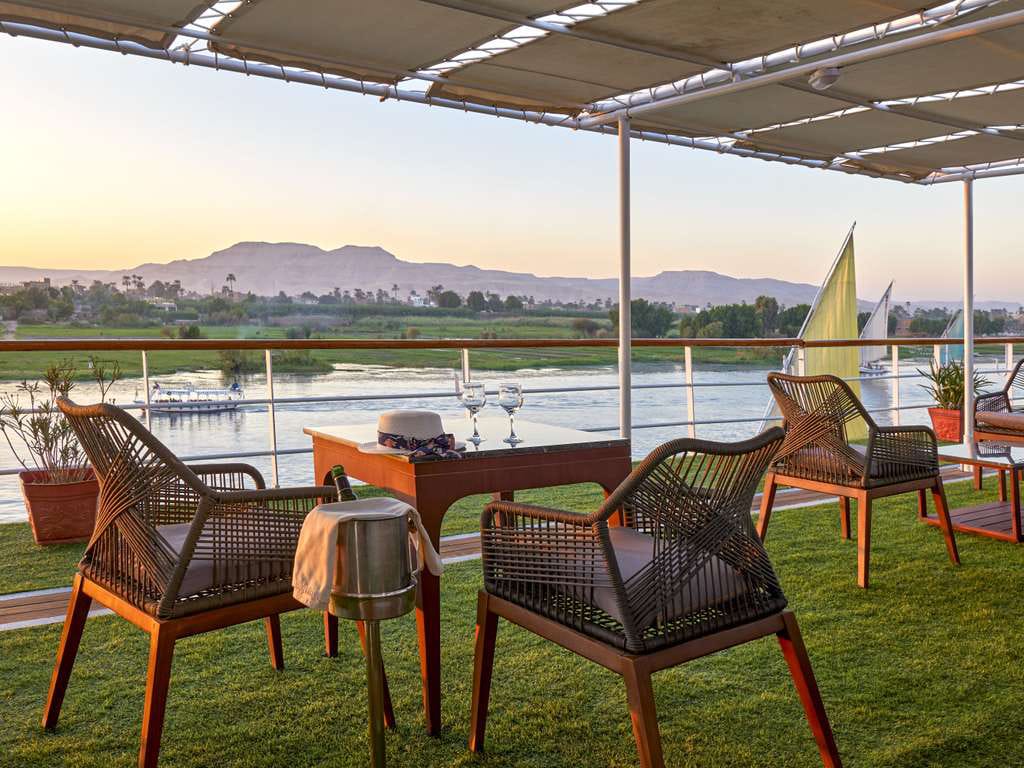 在放松的时刻,沙龙甲板为您呈现尼罗河的壮丽全景。您可以在舒适的休息室享用下午茶,或在半圆形酒吧小酌一杯,尽情沉浸于周围宁静美丽的景色之中。